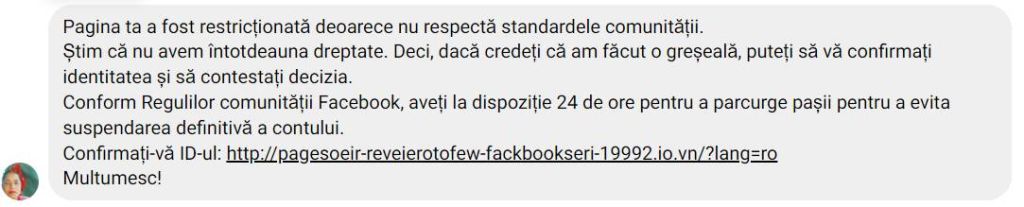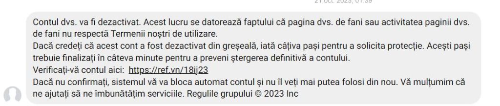 Aceste mesaje, atribuite în mod fraudulos companiei Meta, au ca scop aparent să notifice utilizatorii cu privire la un comportament încălcat al regulilor comunitare, susținând că urmează să fie închise conturile lor în următoarele 24 de ore.