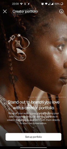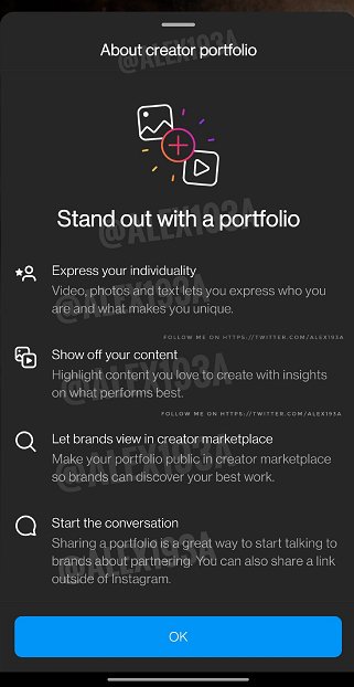 După cum puteți vedea în această captură de ecran, postată de cercetătorul de aplicații Alessandro Paluzzi, Instagram a adăugat acum un nou ecran flash de introducere pentru kit-ul său media, pe care acum îl numește „Portofoliul creatorilor”.