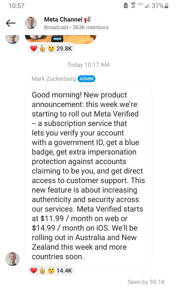 Noile informații transmise de CEO-ul Mark Zuckerberg print-o postare a anunțat că un cont „Meta Verified” va oferi utilizatorilor o insignă verificată. O vizibilitate sporită pe platforme, asistență pentru clienți cu prioritate și multe altele. Funcția se lansează în Australia și Noua Zeelandă în această săptămână. Va ajunge în mai multe țări „în curând”.